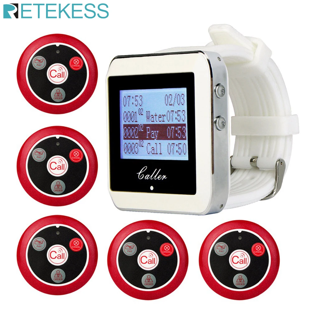 Retekess Restaurant Pager Wireless Calling System Watch Receiver+5 T117 Call Buttons Restaurant Equipment Customer Service cafe