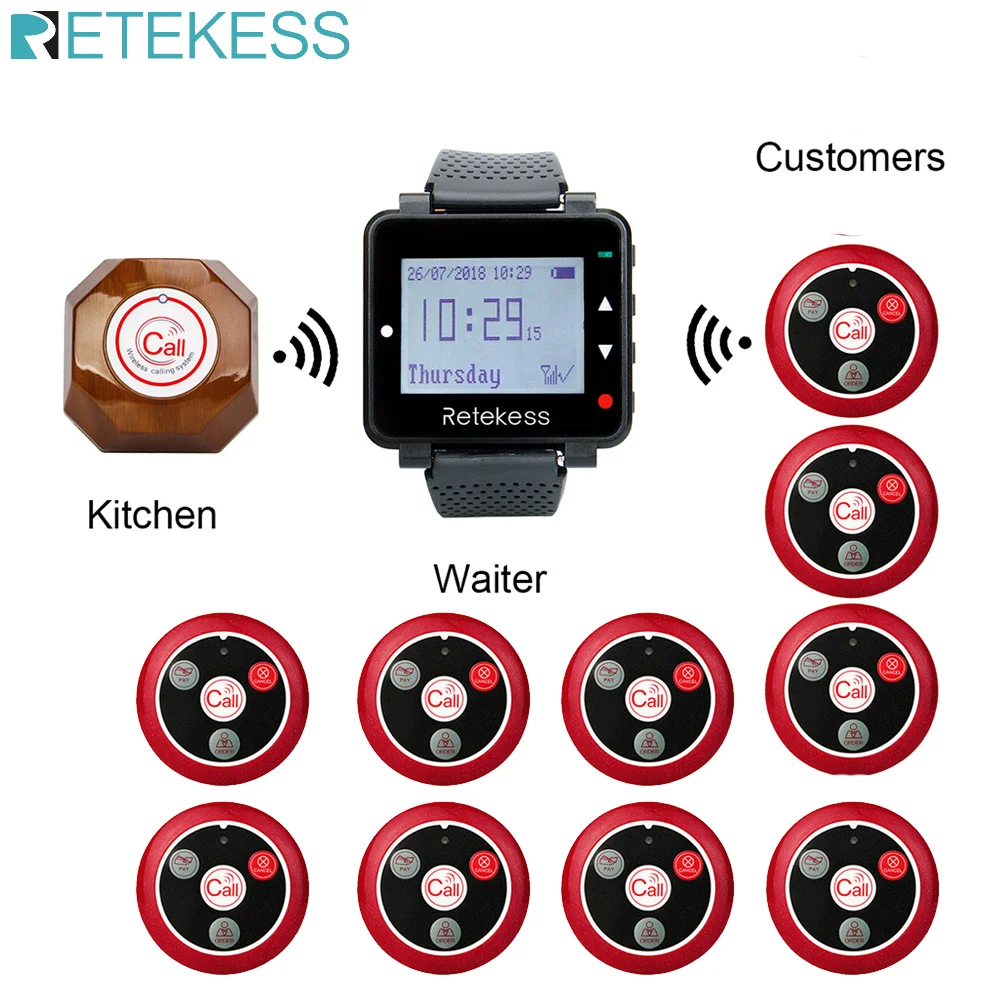RETEKESS Wireless Calling System Restaurant Pager Beeper 1Watch Receiver+1Button For Kitchen+10 Call Buttons For Customers