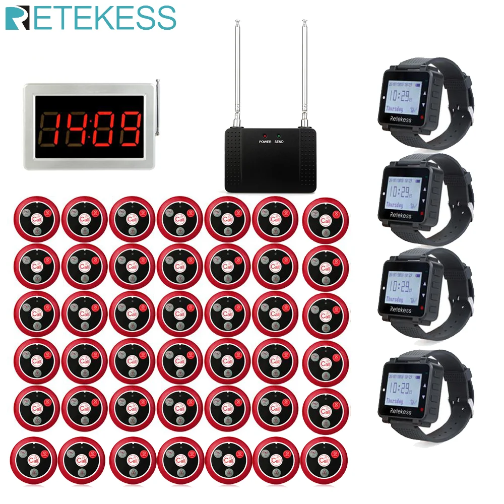 Restaurant Pager Wireless Waiter Calling System 1 Receiver Host+4 Watch Receiver + 1pcs Signal Repeater + 42 Call Button T117