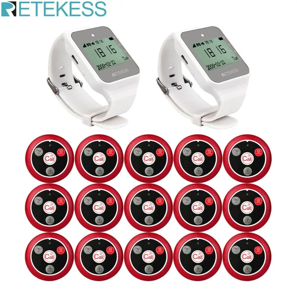 RETEKESS Wireless Waiter Calling System Customer Service Restaurant 2pcs TD108 Watch Receiver + 15 Call Button Wireless Pagers