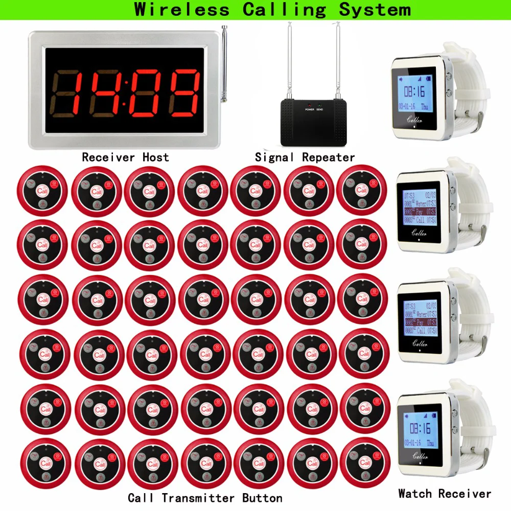 Retekess Restaurant Pager Wireless Calling System 1 Receiver Host+4 Watch Receiver + 1pcs Signal Repeater + 42 Call Button T117