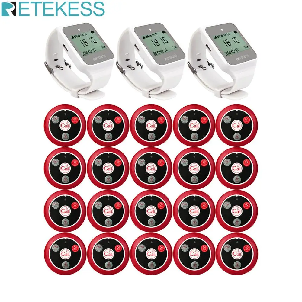 RETEKESS Wireless Waiter Calling System Customer Service Restaurant 3pcs TD108 Watch Receiver +20pcs Call Button Wireless Pagers