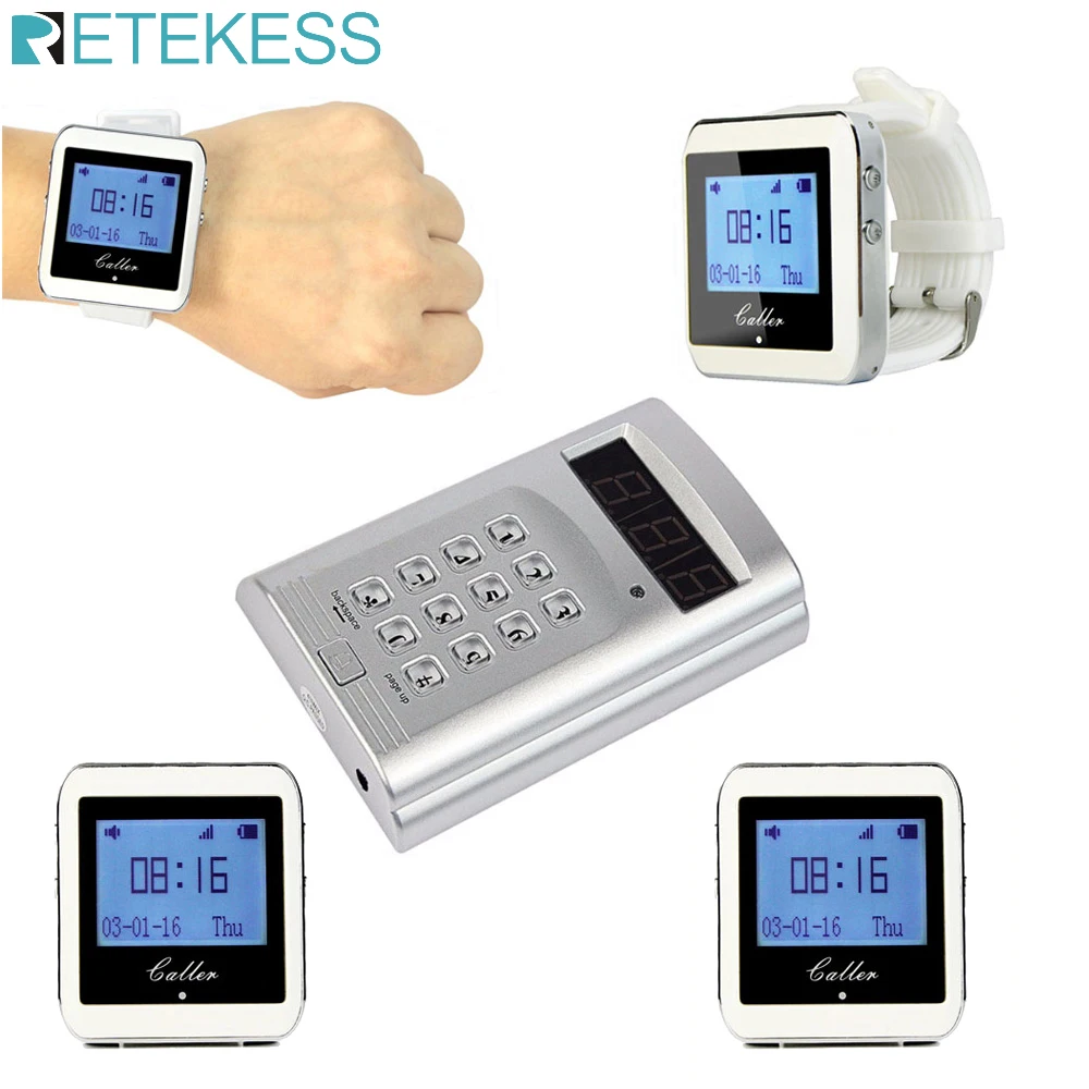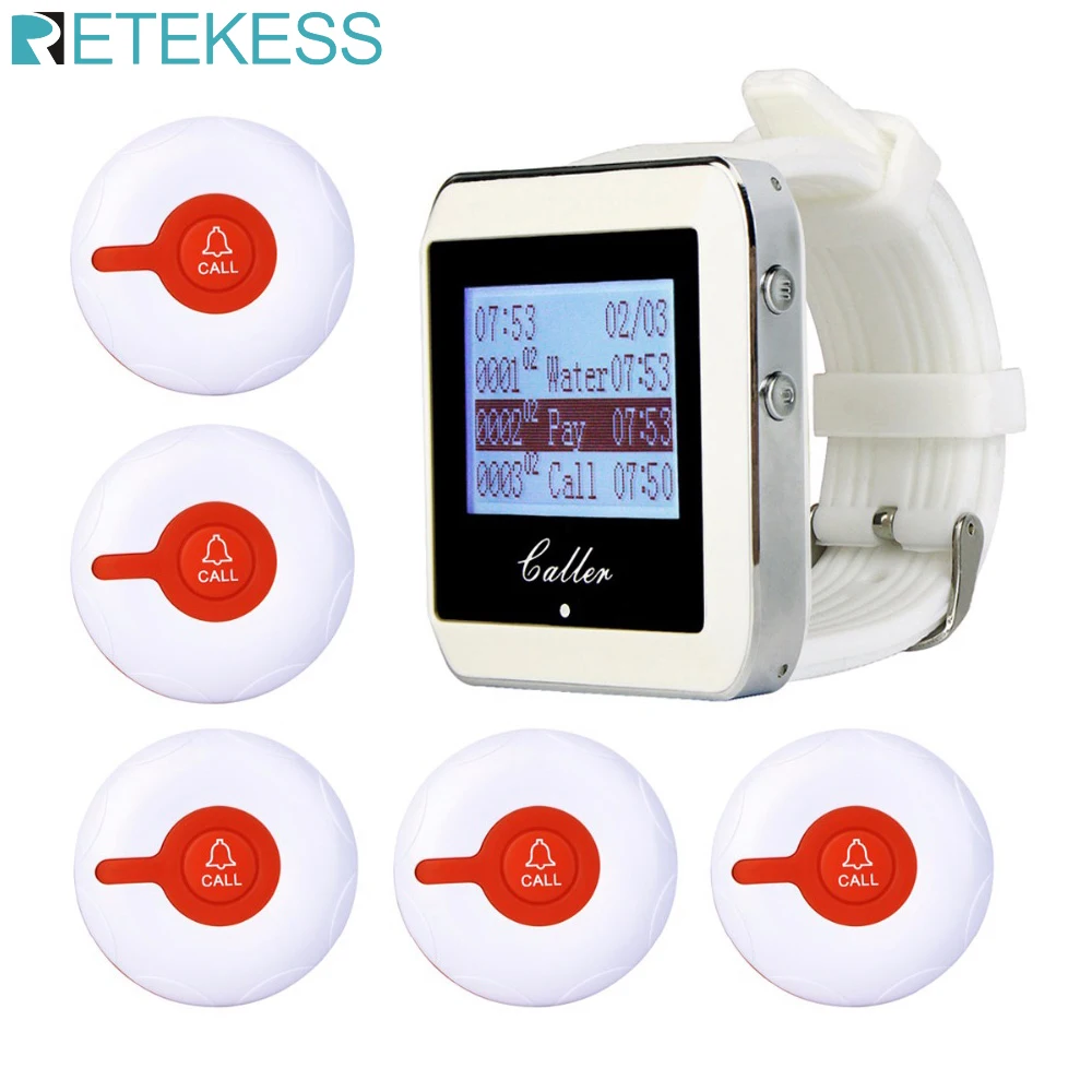 RETEKESS 999 Channel Restaurant Pager Wireless Waiter Calling System 1Watch Pager+5pcs Call Transmitter Buttons cafe F3288B