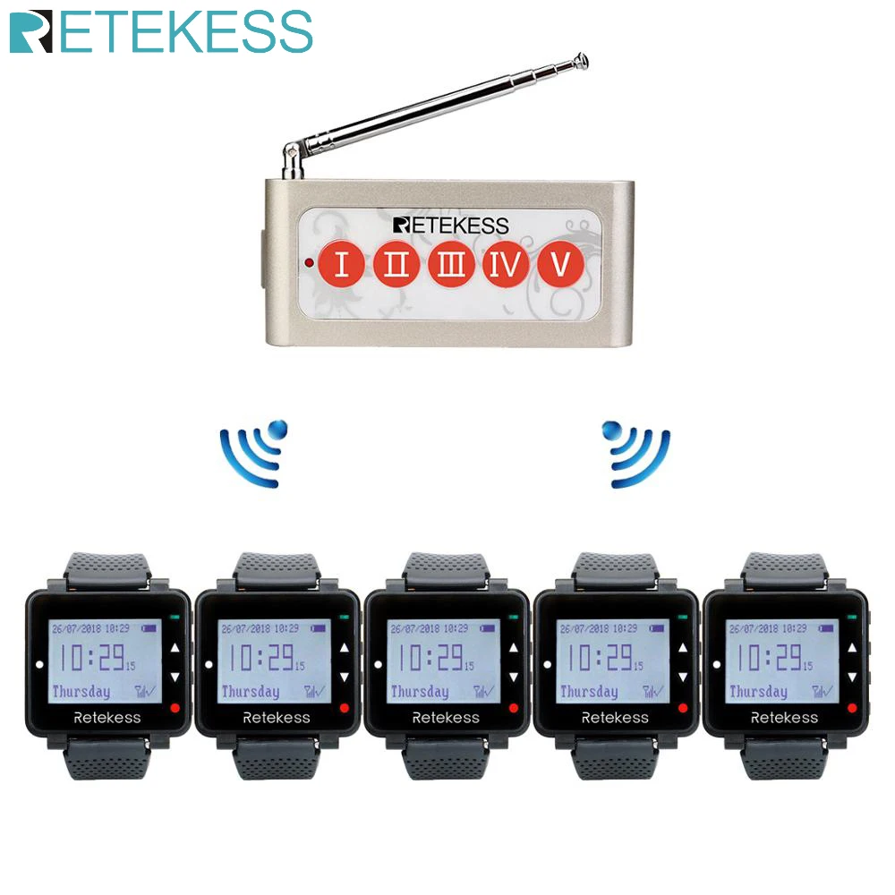 Retekess Restaurant Wireless Calling System Kitchen Call Waiter 5pcs Wtach Receivers+1Five Keys Call Button Restaurant Equipment