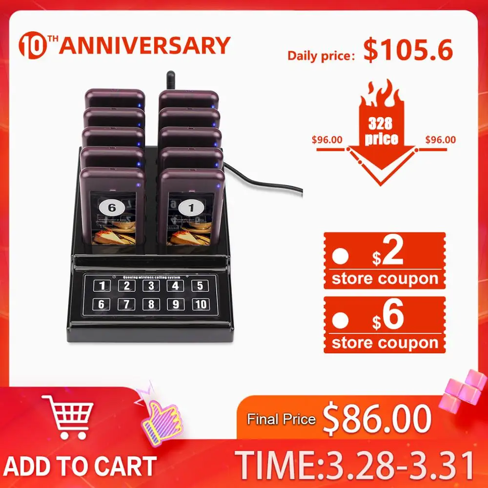 RETEKESS Wireless Waiter Calling System For Restaurant Service Pager System Guest Pager 1Watch Receiver+10 Call Buttons F3288B