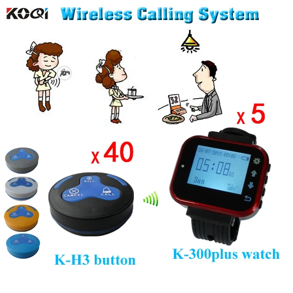 Wireless Sound System Waiter Service Calling System 40pcs Waterproof Press Buttons and 5pcs Smart Waitress Watch Free Shipping