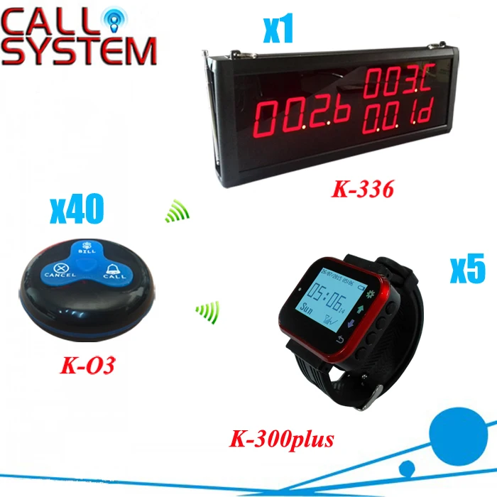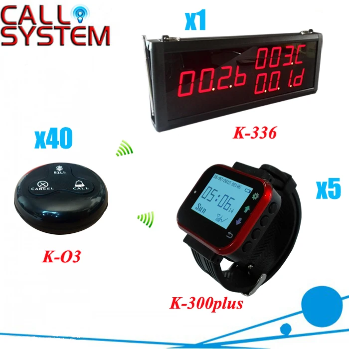 Wireless Call Button System for restaurant service, one set with 1 display, 5 watches and 40 table buttons